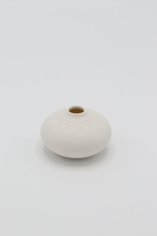Handgedraaide porseleinen vaasjes met elk een uniek gekerfd patroon. Van binnen geglazuurd dus waterdicht en geschikt voor een (pluk)bloemetje.