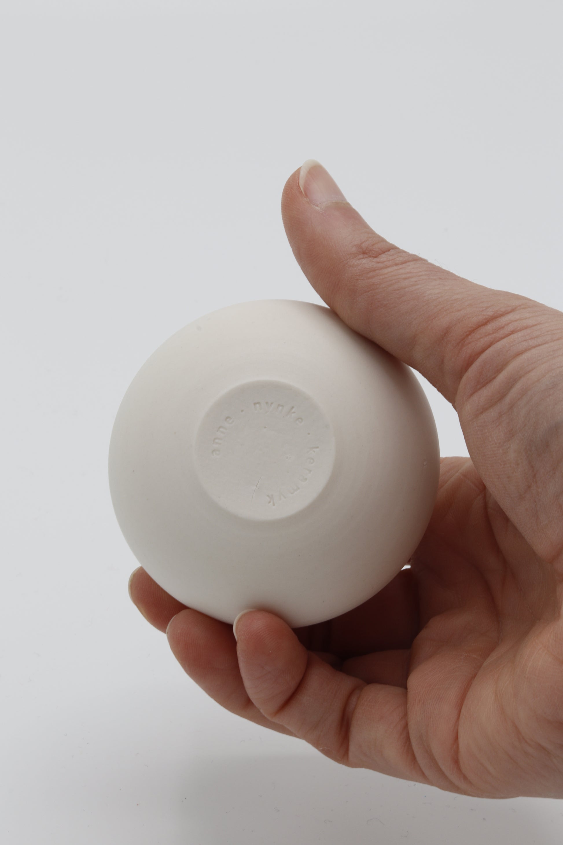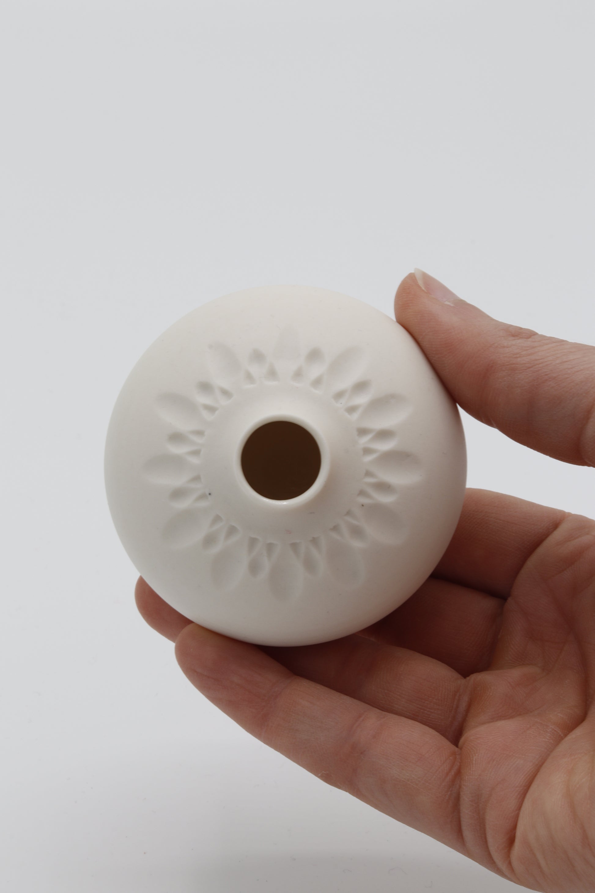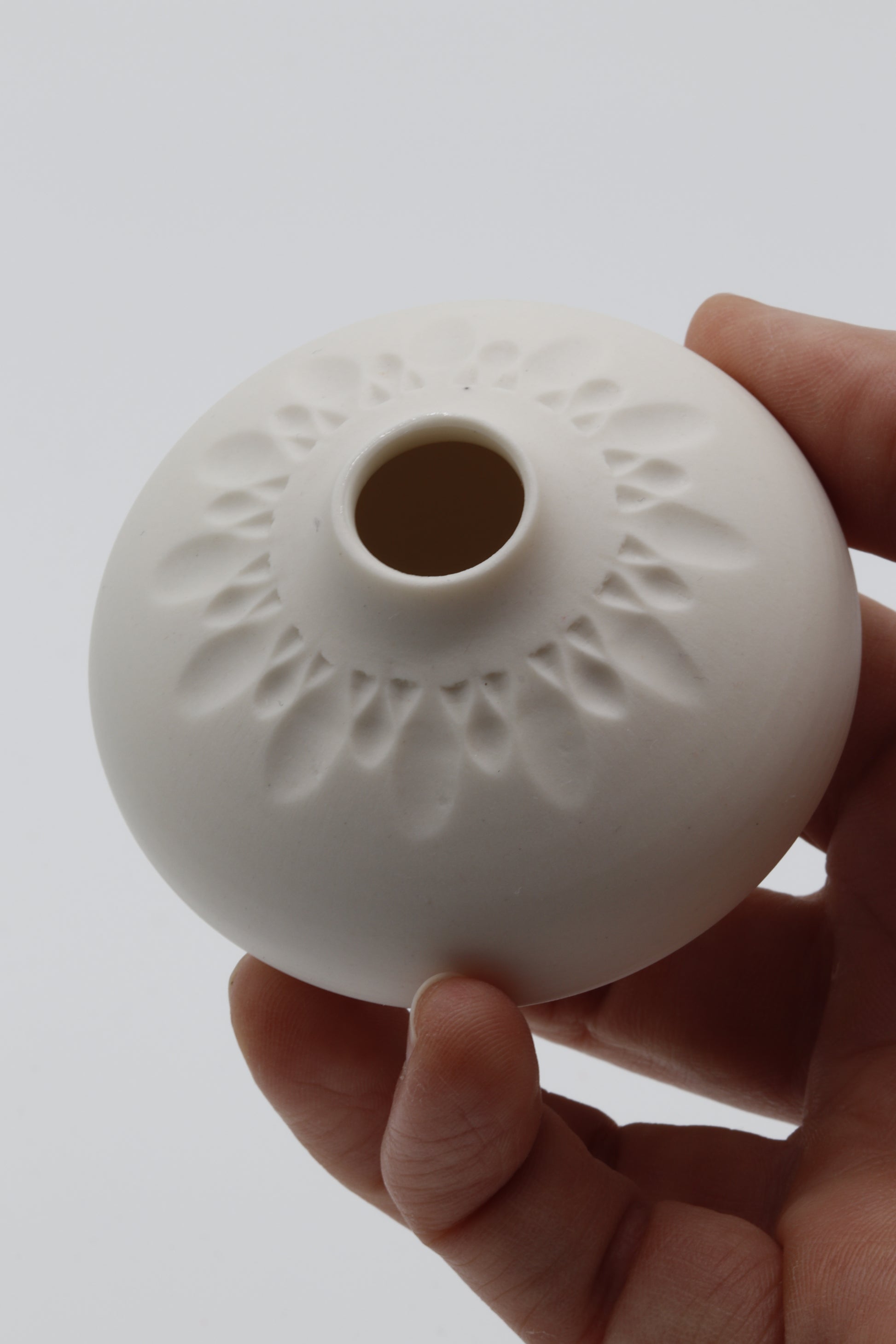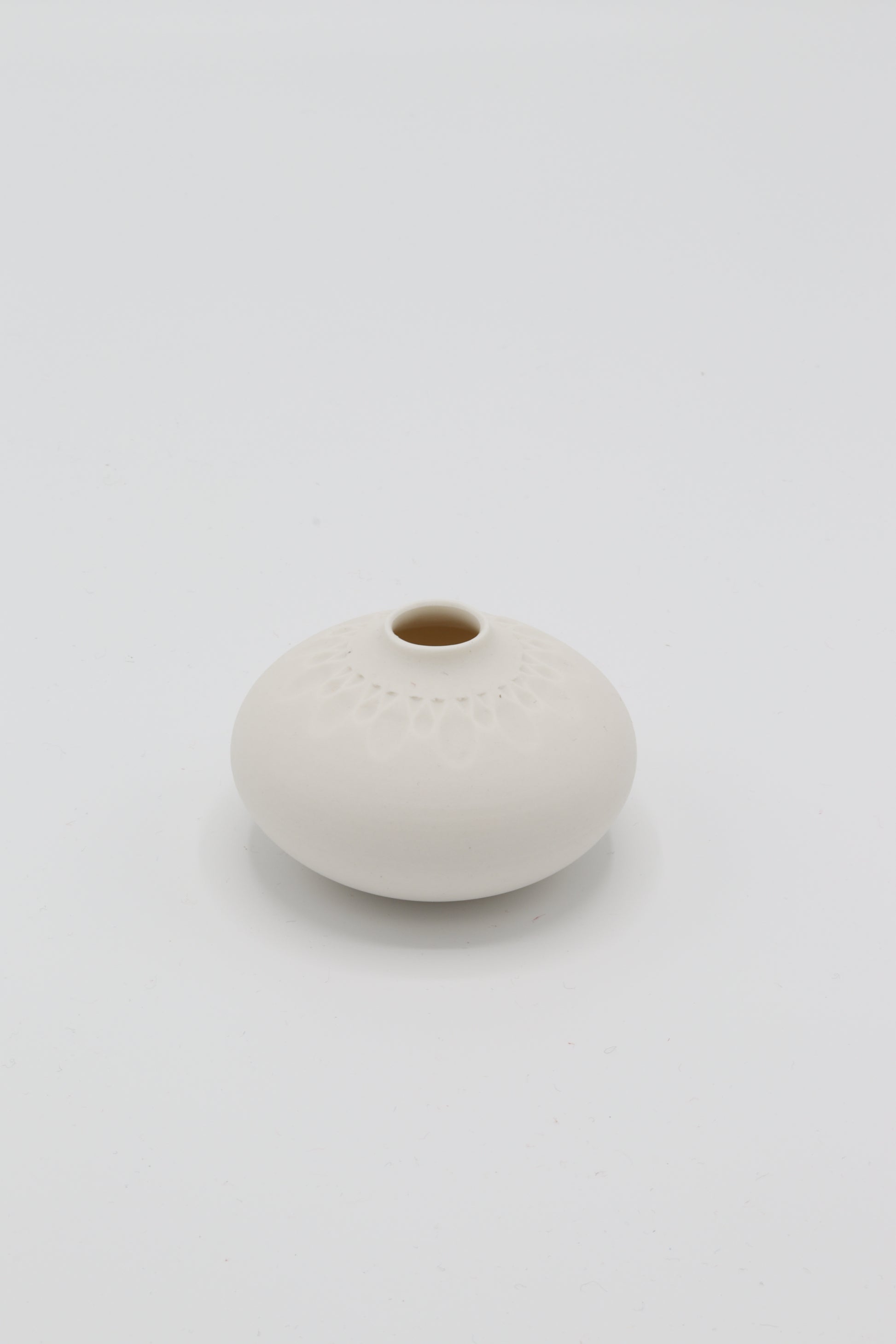 Handgedraaid vaasje van porselein met inkervingen. Aan de binnenkant is dit vaasje geglazuurd met een glanzend wit glazuur en gestookt op steengoed temperatuur en daardoor waterdicht. De buitenkant is gepolijst en voelt daardoor zacht aan. Dit vaasje is handgekerfd en daarmee uniek. Afmetingen: ongeveer 6.5x4cm (⌀xh).