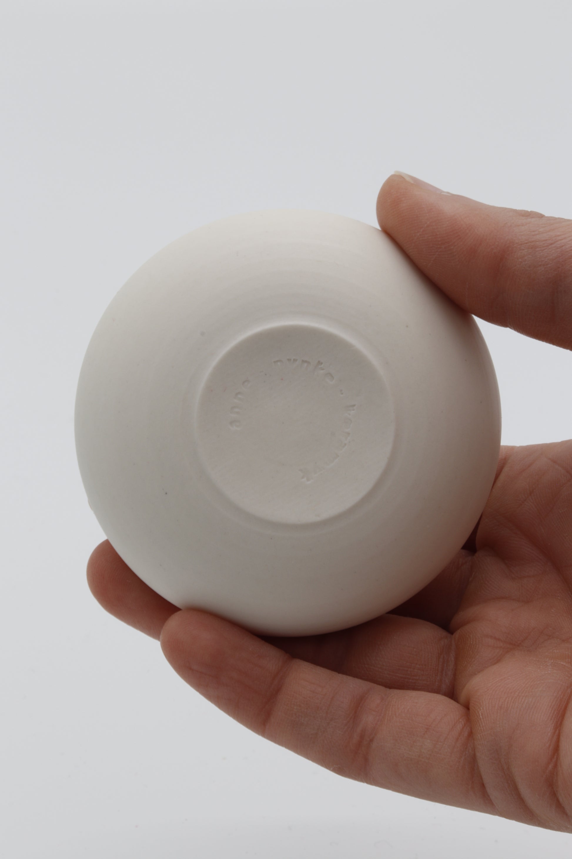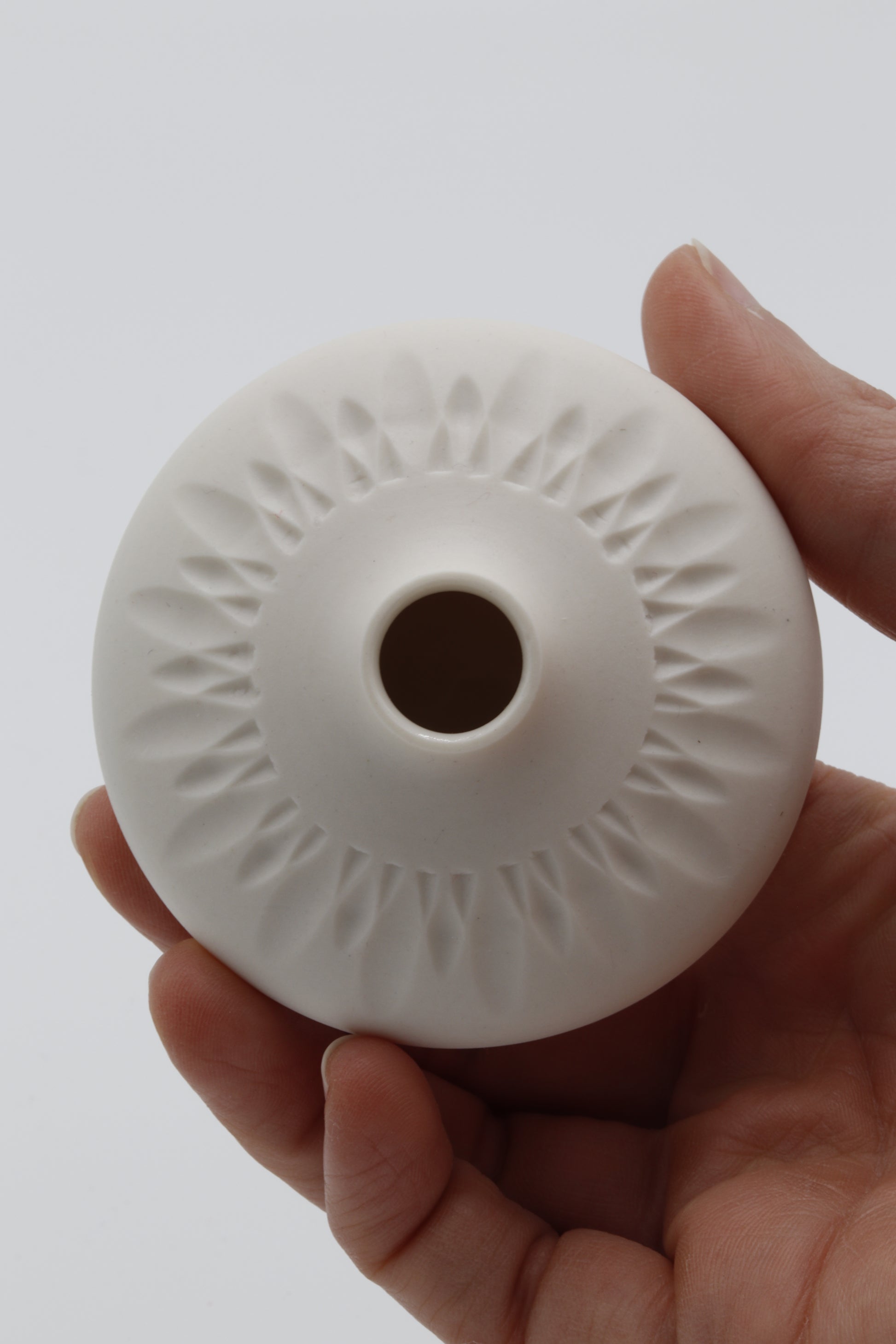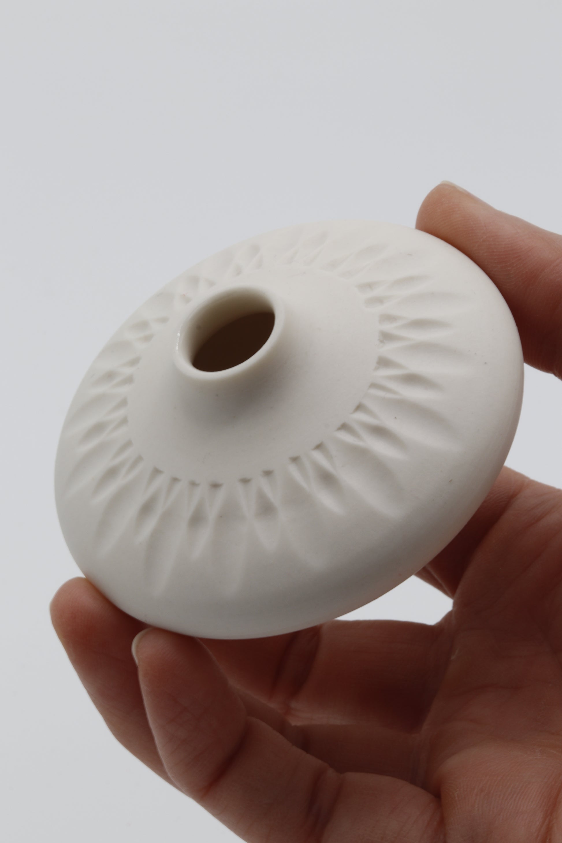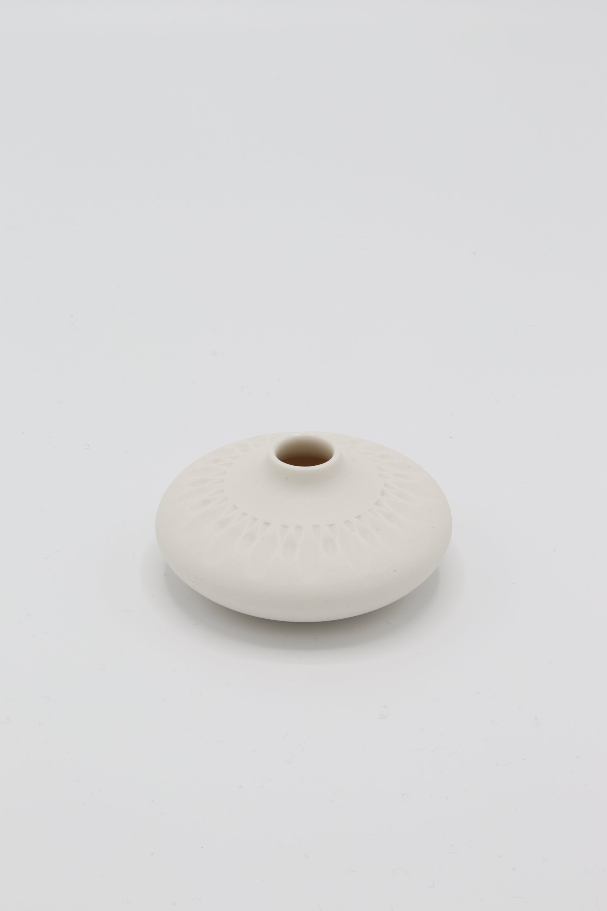 Handgedraaid vaasje van porselein met inkervingen. Aan de binnenkant is dit vaasje geglazuurd met een glanzend wit glazuur en gestookt op steengoed temperatuur en daardoor waterdicht. De buitenkant is gepolijst en voelt daardoor zacht aan. Dit vaasje is handgekerfd en daarmee uniek. Afmetingen: ongeveer 7x3.5cm (⌀xh).