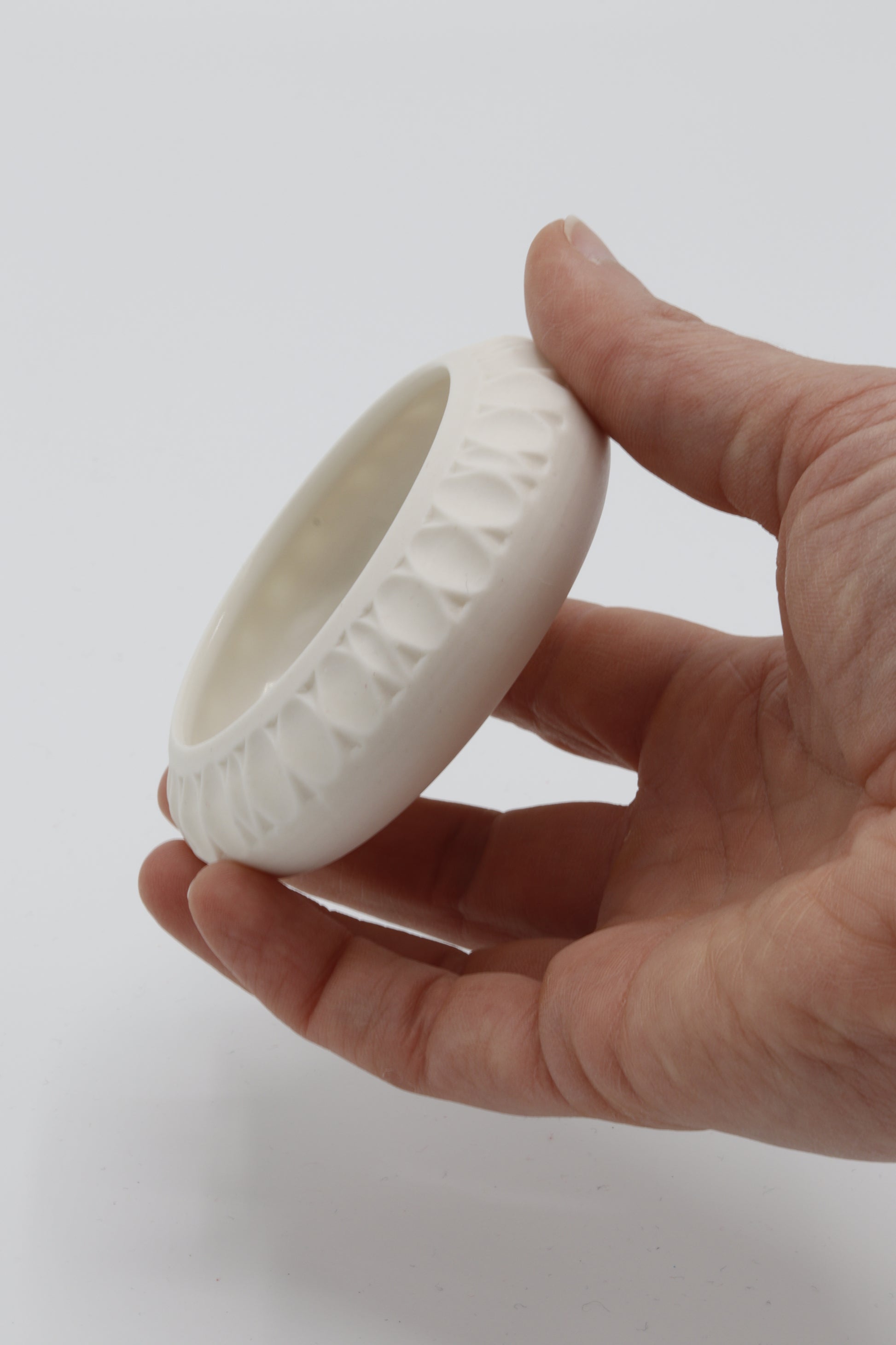 Handgedraaid porseleinen schaaltje met inkervingen. Aan de binnenkant geglazuurd met een glanzend wit glazuur. Gestookt op steengoed temperatuur. De buitenkant is gepolijst en voelt daardoor zacht aan. Dit schaaltje is zodanig ingekerfd dat het een klein beetje doorschijnend is. Daarnaast is elk handgekerfd stuk uniek. Afmetingen: ongeveer 8.5x2.5cm (⌀xh).