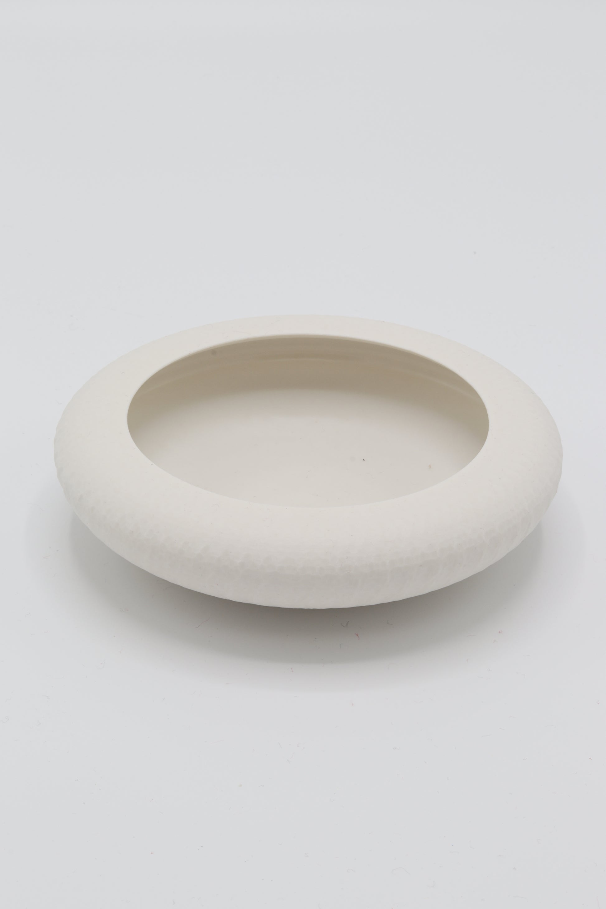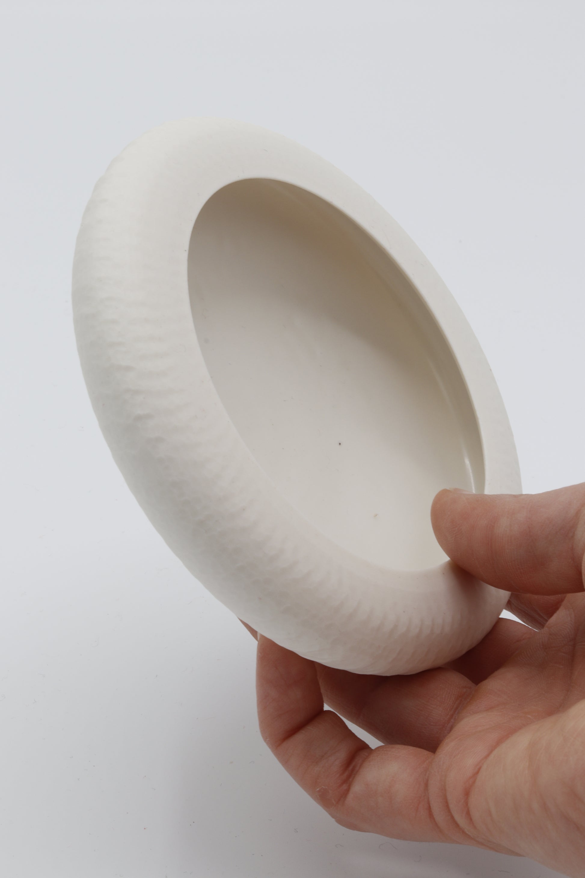 Handgedraaid porseleinen schaaltje met een decoratieve techniek (chattering). Aan de binnenkant geglazuurd met een glanzend transparant glazuur. Gestookt op steengoed temperatuur. Afmetingen: ongeveer 12x3cm (⌀xh).