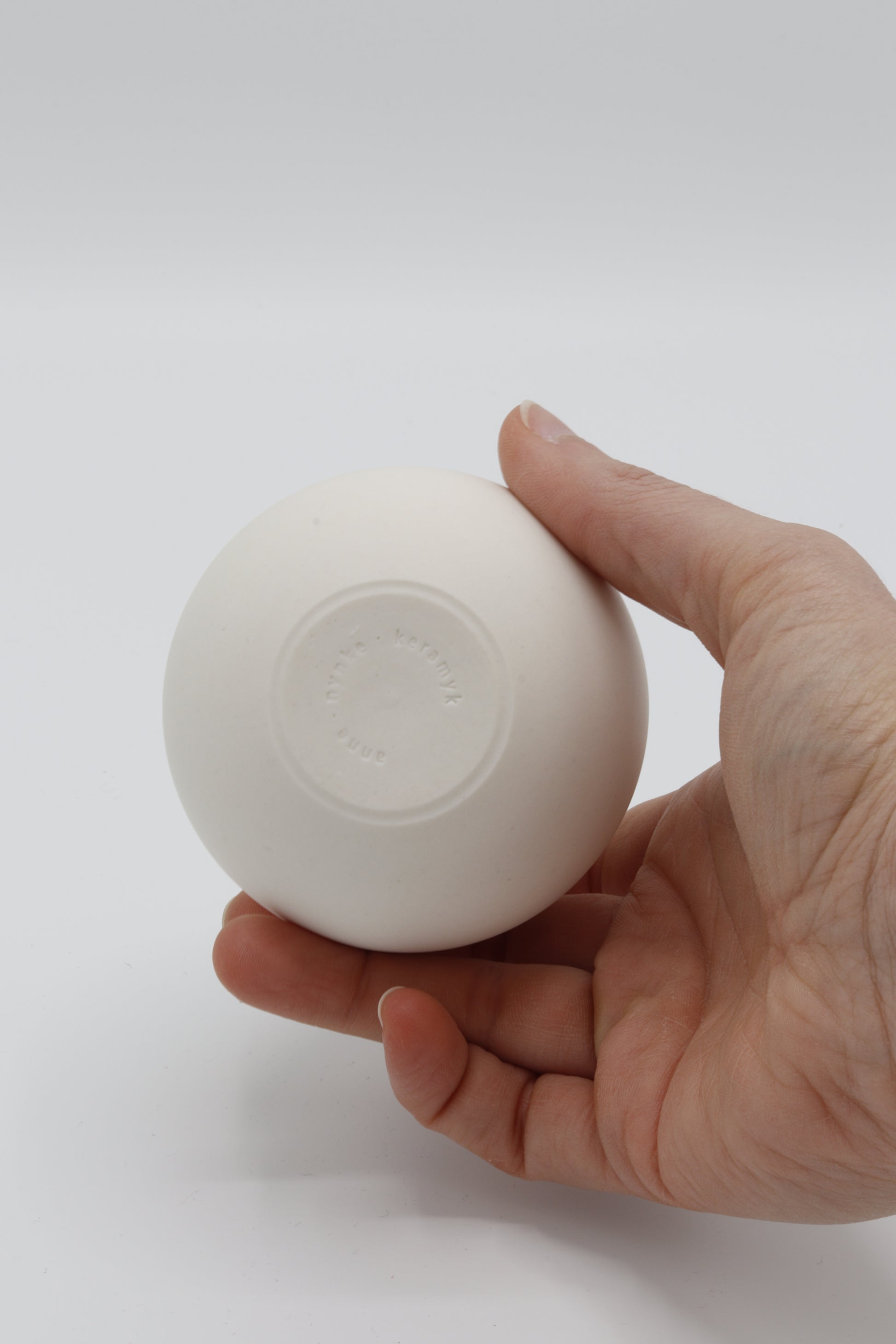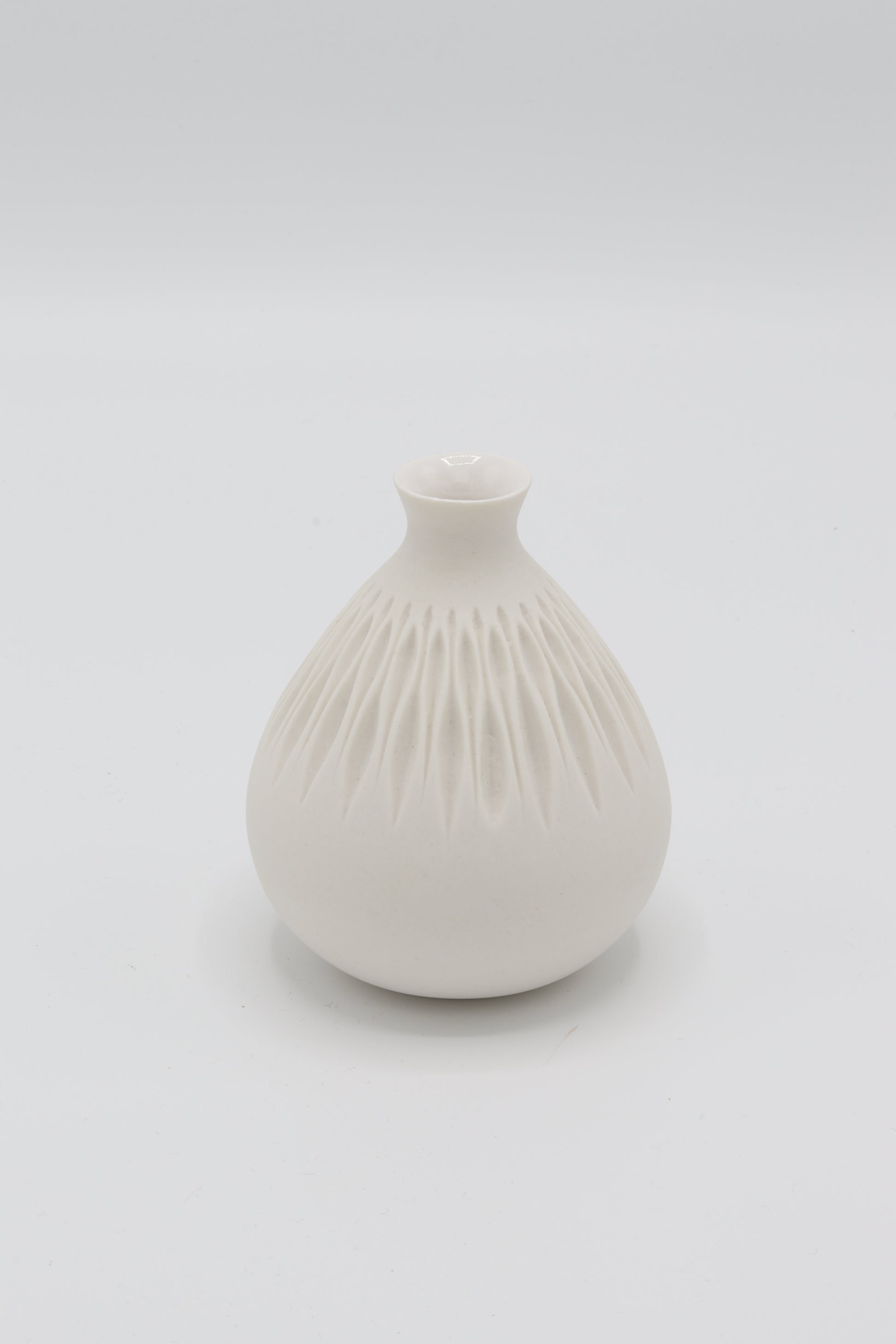 Handgedraaid vaasje van porselein met inkervingen. Aan de binnenkant is dit vaasje geglazuurd met een glanzend wit glazuur en gestookt op steengoed temperatuur en daardoor waterdicht. De buitenkant is gepolijst en voelt daardoor zacht aan. Dit vaasje is handgekerfd en daarmee uniek. Afmetingen: ongeveer 7.5x9cm (⌀xh).