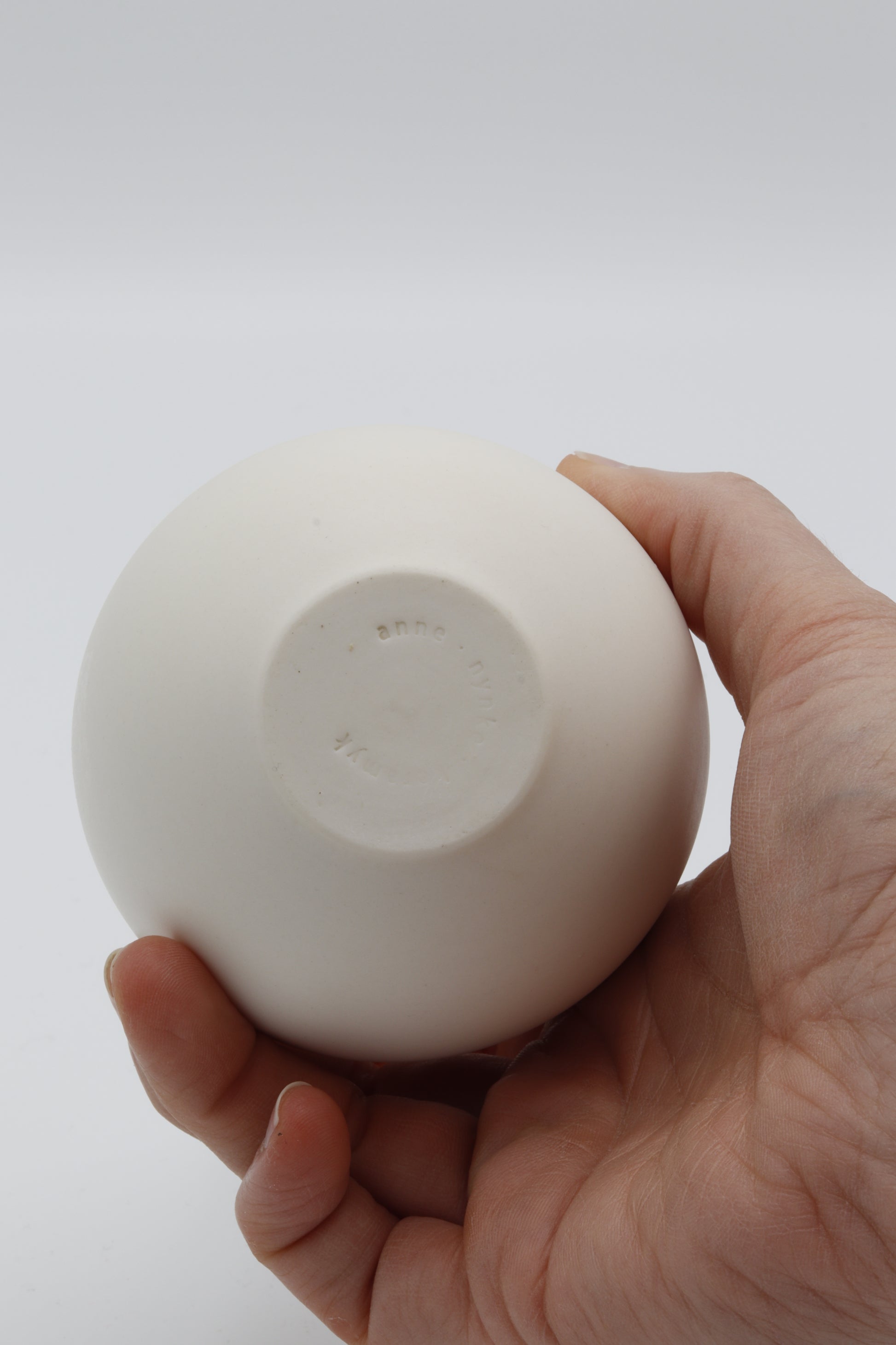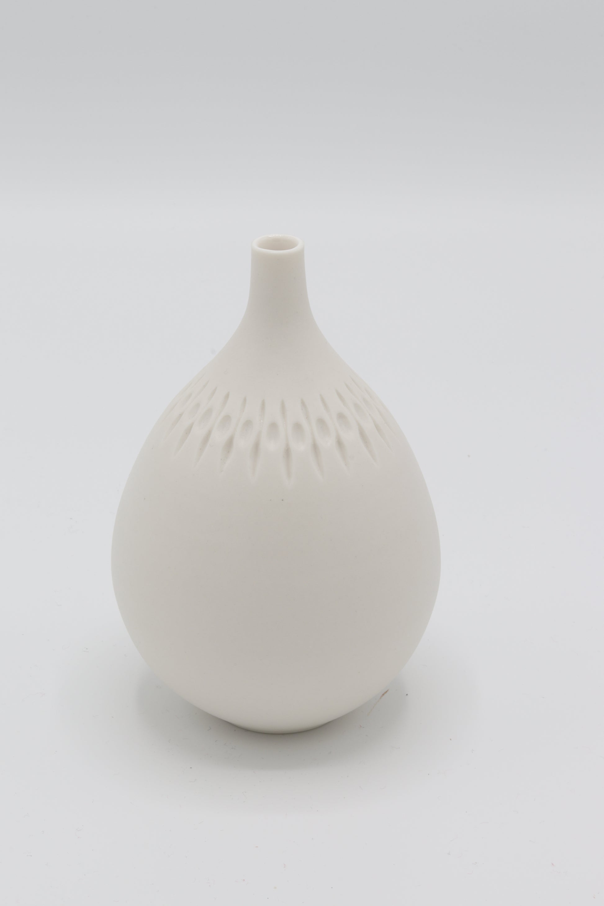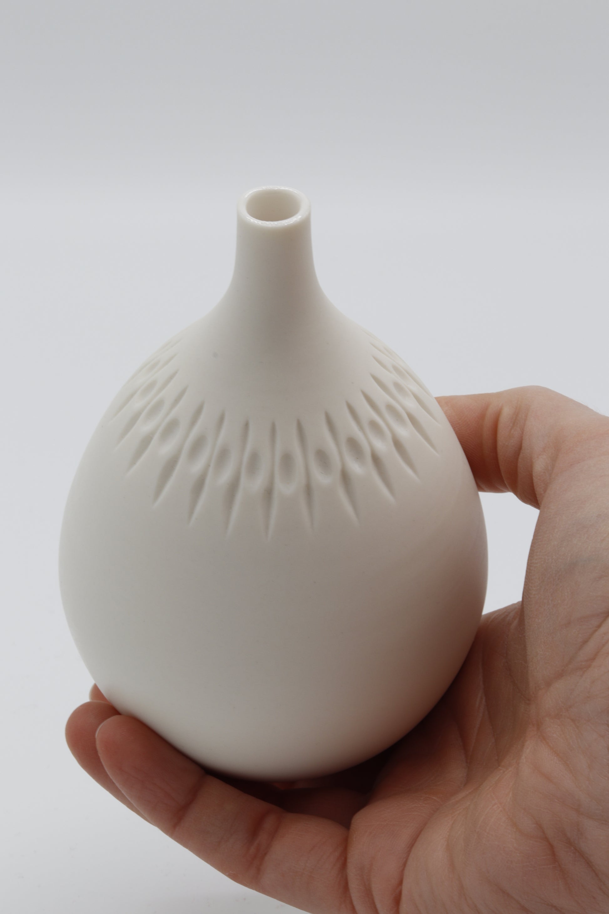 Handgedraaid vaasje van porselein met inkervingen. Aan de binnenkant is dit vaasje geglazuurd met een glanzend wit glazuur en gestookt op steengoed temperatuur en daardoor waterdicht. De buitenkant is gepolijst en voelt daardoor zacht aan. Dit vaasje is handgekerfd en daarmee uniek. Afmetingen: ongeveer 7.5x12.5cm (⌀xh).