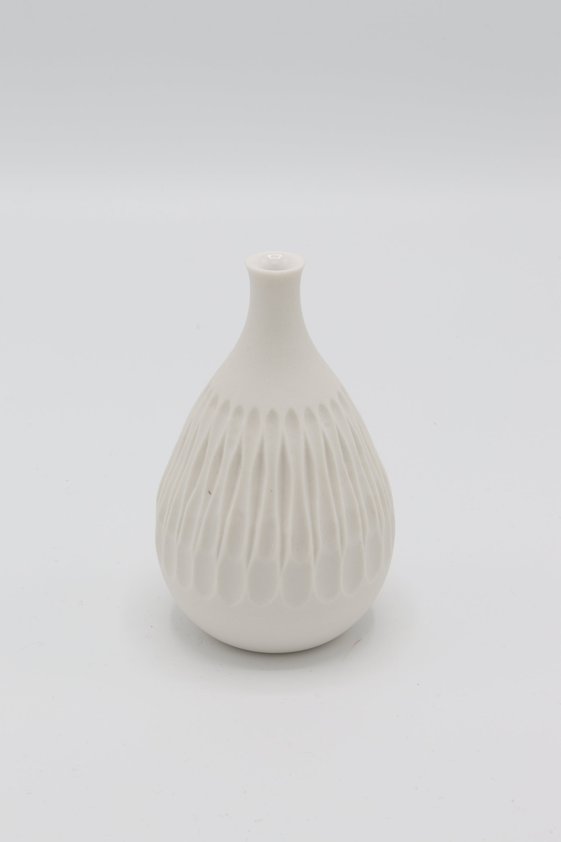 Handgedraaid vaasje van porselein met inkervingen. Aan de binnenkant is dit vaasje geglazuurd met een glanzend wit glazuur en gestookt op steengoed temperatuur en daardoor waterdicht. De buitenkant is gepolijst en voelt daardoor zacht aan. Dit vaasje is handgekerfd en daarmee uniek. Afmetingen: ongeveer 6x11cm (⌀xh).