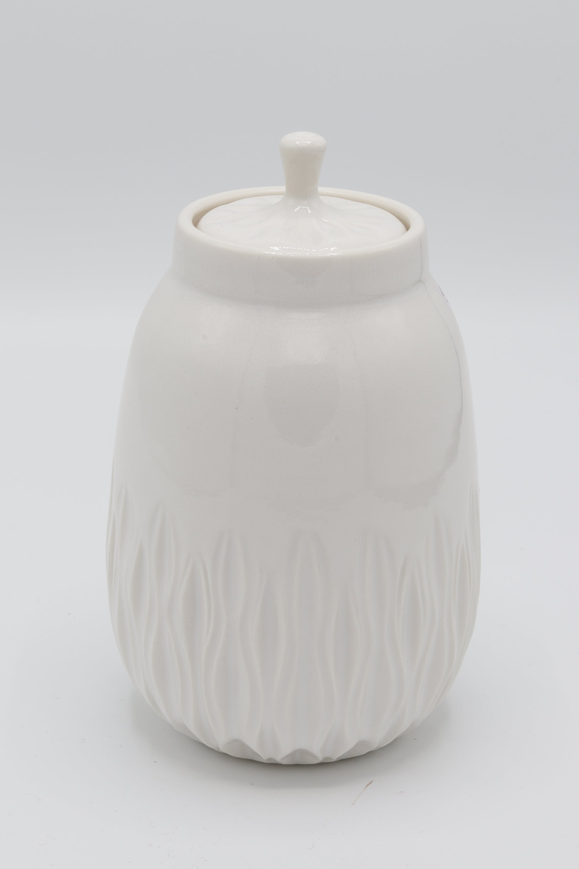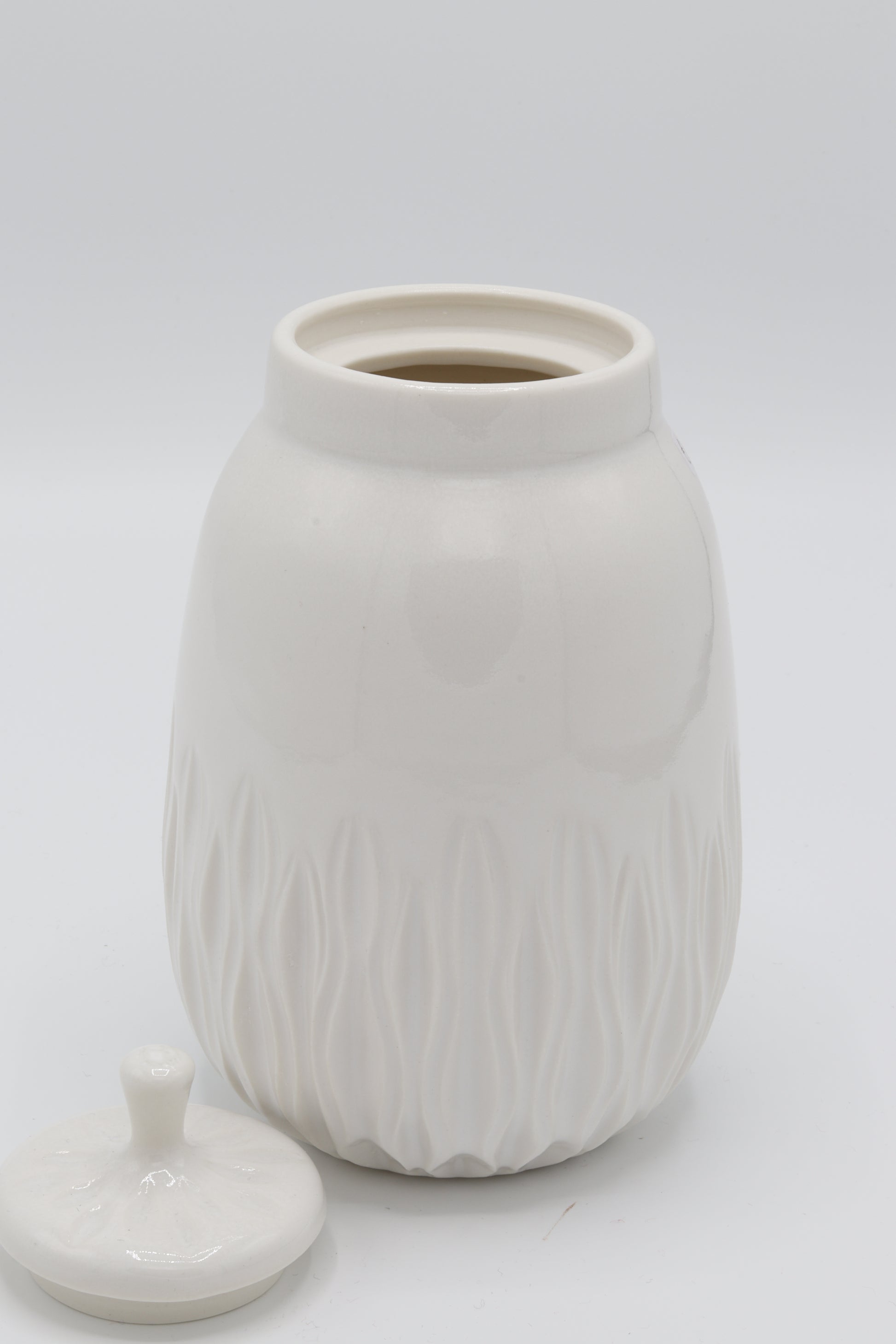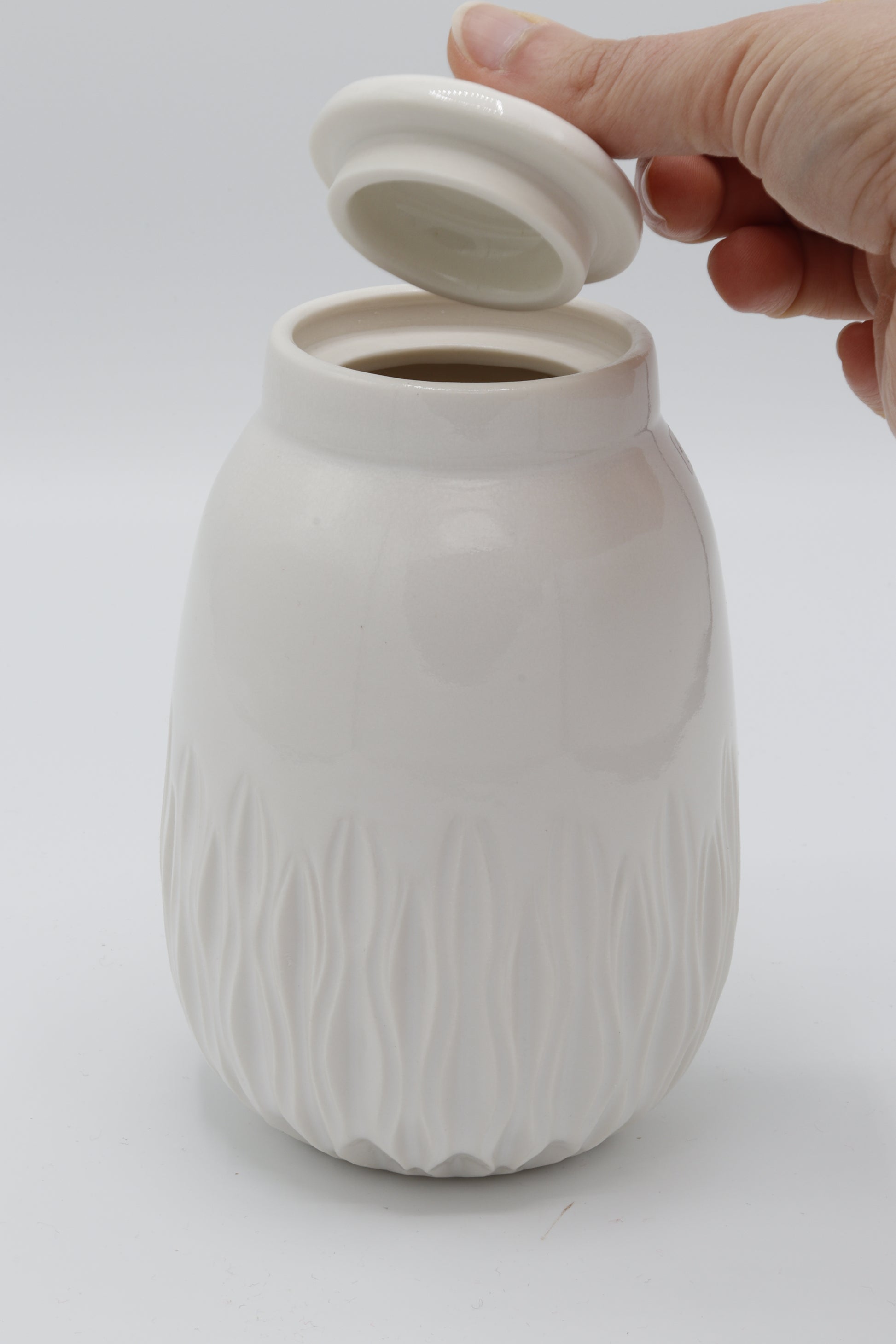 Handgedraaide dekselpot van porselein met inkervingen. Aan de binnen- en buitenkant geglazuurd met een glanzend wit glazuur en gestookt op steengoed temperatuur en daardoor waterdicht. Daarnaast is elk handgekerfd stuk uniek. Afmetingen: ongeveer 10x17cm (⌀xh). Gat opening: ⌀4.5cm
