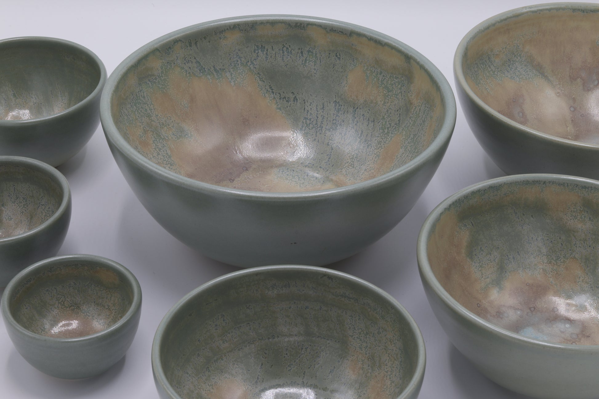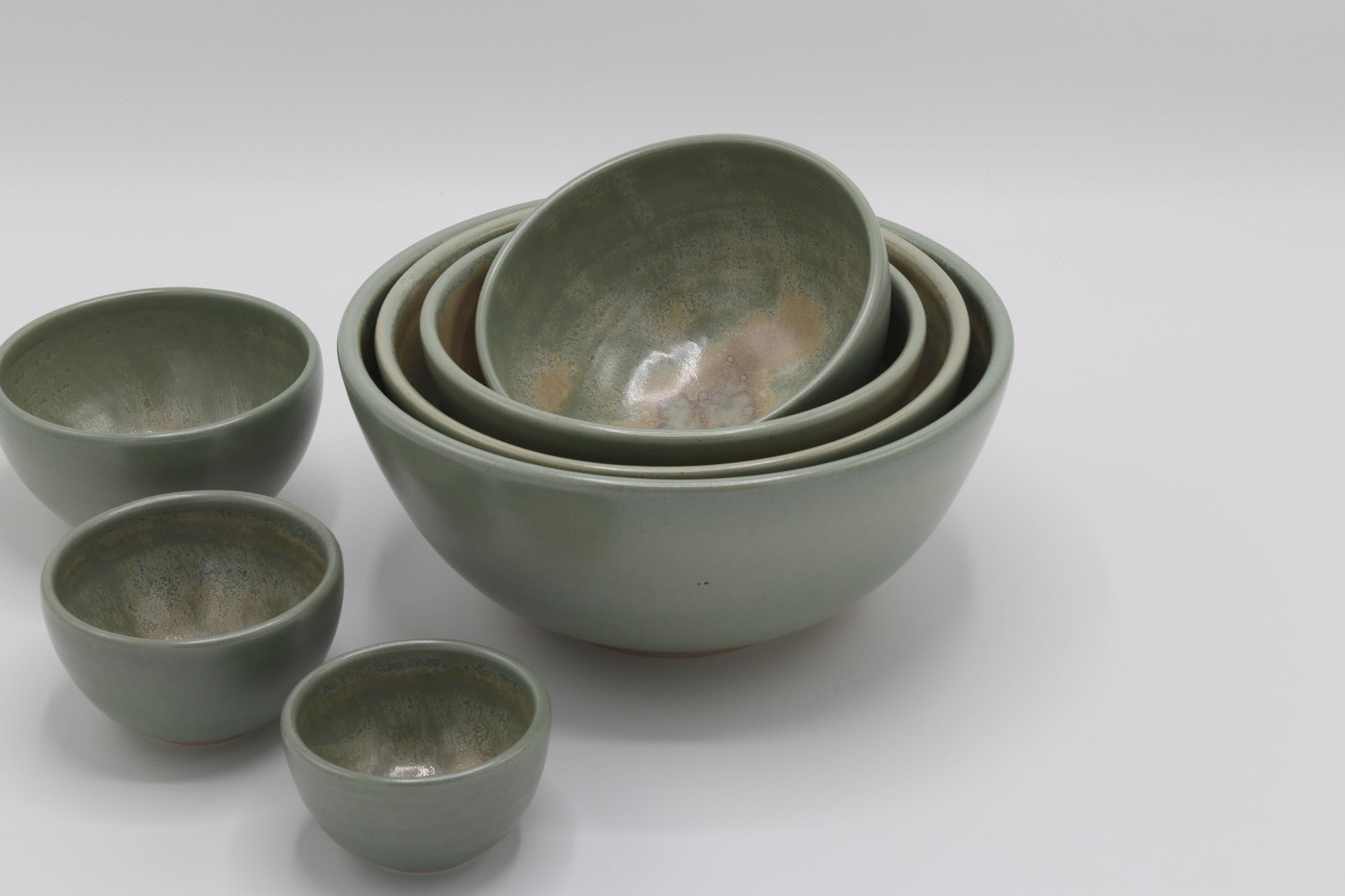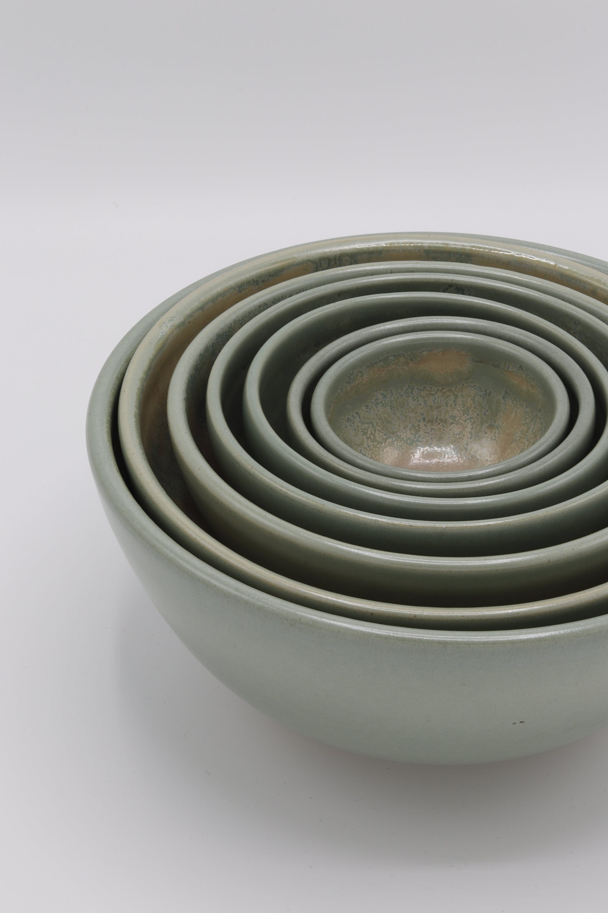 Set van 7 handgedraaide nest schalen van steengoed. Geglazuurd met een groen effect glazuur. Gestookt op steengoed temperatuur en daardoor geschikt voor de vaatwasser.